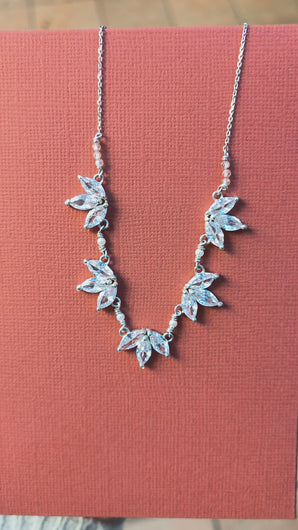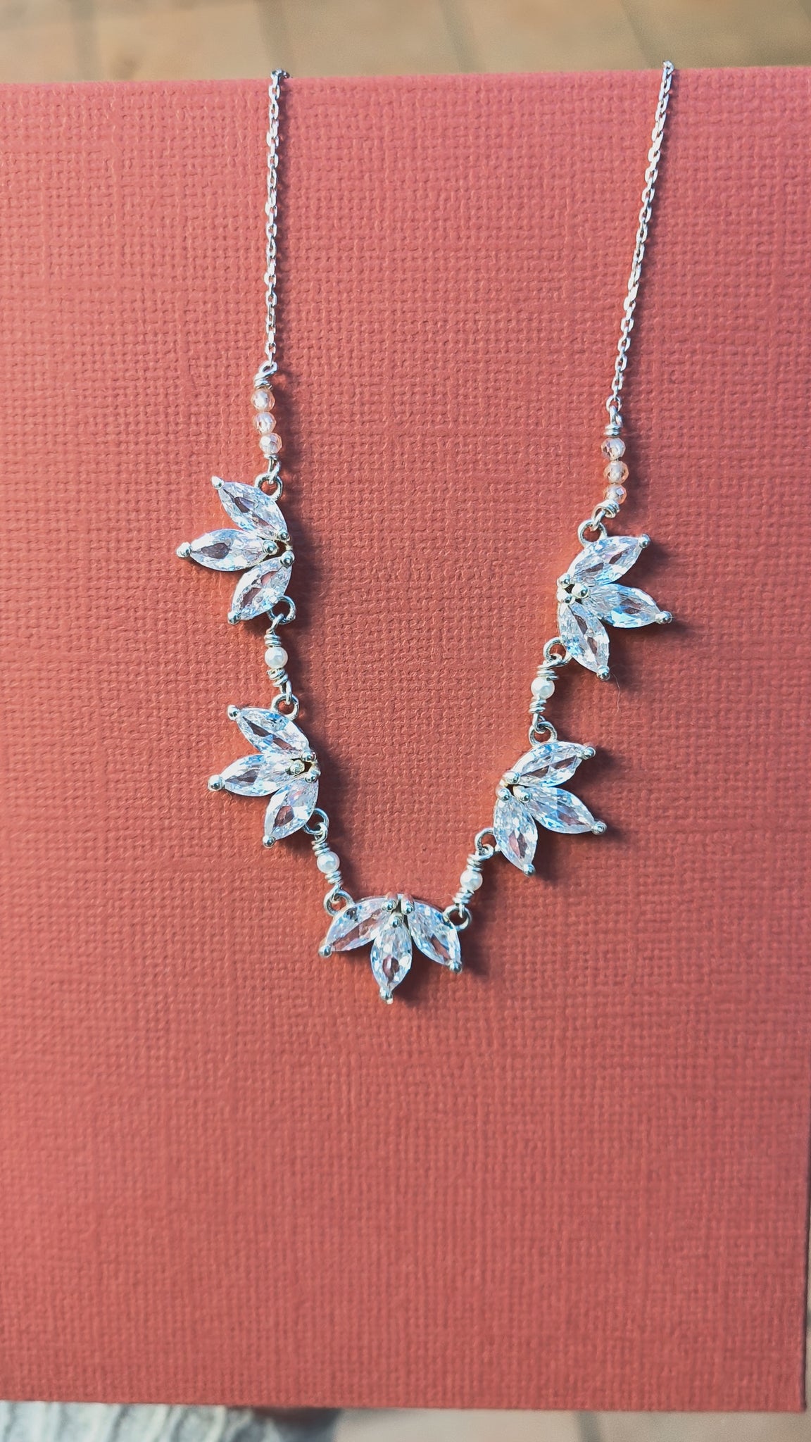collier en argent sur chaine avec 5 fleurs de 3 pétales et petites perles d'eau douce et petites perles verre.